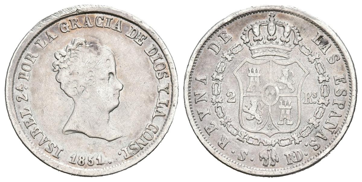 ISABEL II (1833-1868). 2 Reales. (Ar. 2,57g/18mm). 1851. Sevilla RD. (Cal-2019-388). MBC.