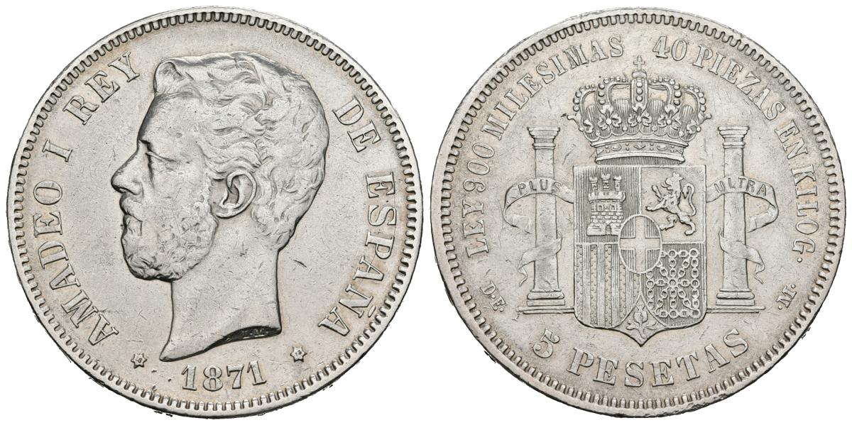 AMADEO I (1871-1873). 5 Pesetas (Ar. 24,91g/36mm). 1871 *18-73. Madrid. (Cal-2019-3). MBC. Rara.