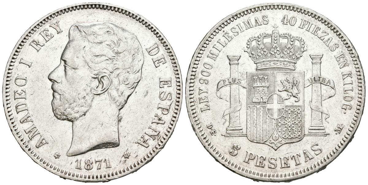 AMADEO I (1871-1873). 5 Pesetas. (Ar. 24,91g/37mm). 1871 *18-75. Madrid DEM. (Cal-2019-7). Acuñada bajo el reinado de Alfonso XII. MBC+. Marquitas.