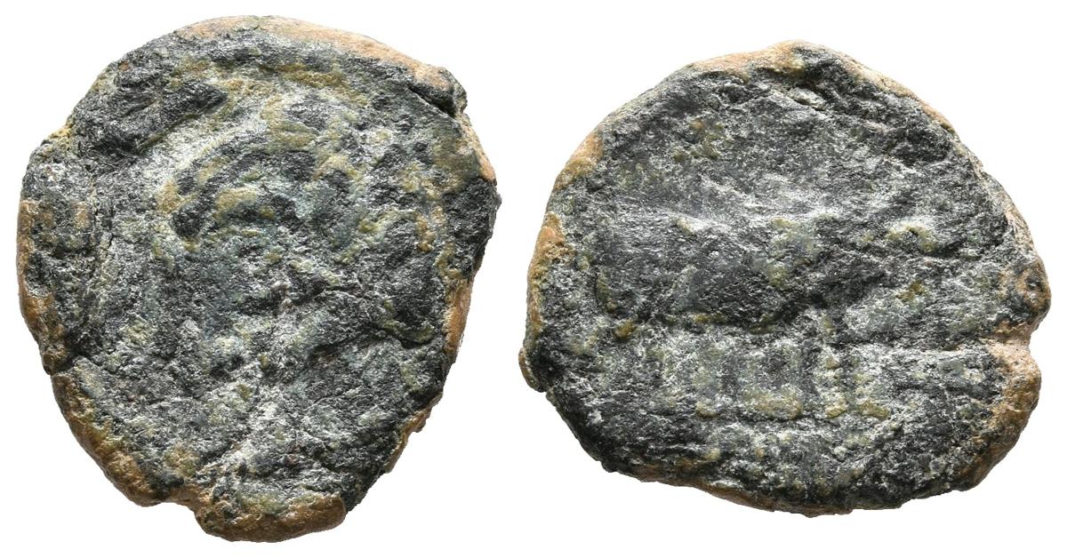 ICALCUNSCEN (Iniesta, Cuenca). Cuadrante. (Ae. 2,57g/16mm). 120-20 a.C. (FAB-1420). Anv: Cabeza masculina a derecha, detrás delfín. Rev: Jabalí a derecha, encima cuatro puntos, debajo leyenda ibérica: ICaLCuNSCeN. MBC-. Muy raro.