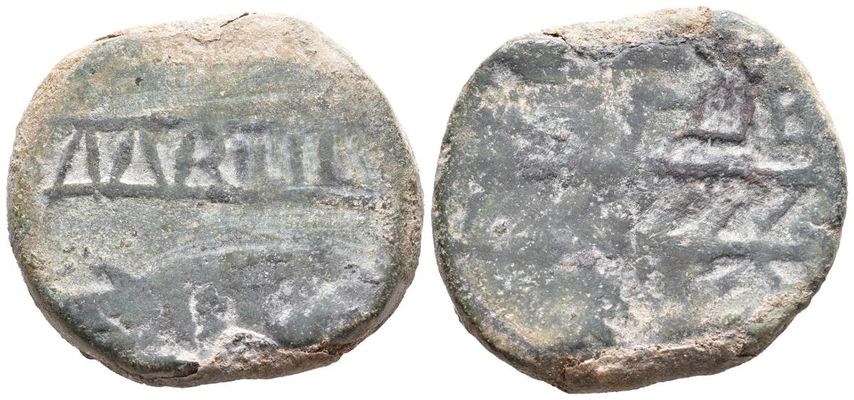 MURTILIS (Mértola, Portugal). Dupondio. (Ae. 29,11g/32mm). 120-50 a.C. (FAB-1757). Anv: Atún a derecha, encima leyena: MVRTIL, entre dos líneas. Rev: Espiga a derecha, encima leyenda: L ACP, entre dos líneas. BC+. Pátina verde. Raro.