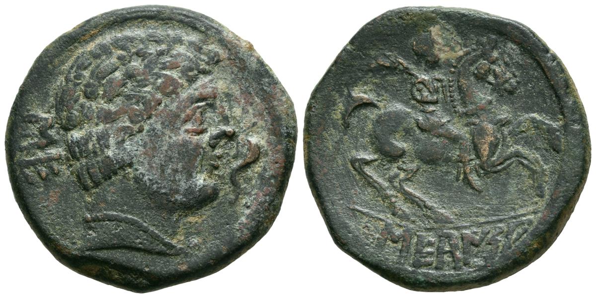 SECAISA (Segeda, Zaragoza). As. (Ae. 18,27g/31mm). 120-20 BC (FAB-2121). Anv: Cabeza masculina a derecha, detrás letras ibéricas: SE, delante delfín. Rev: Jintete con palma a derecha, debajo leyenda ibérica: SECaISA. MBC-. Rayas de limpieza.