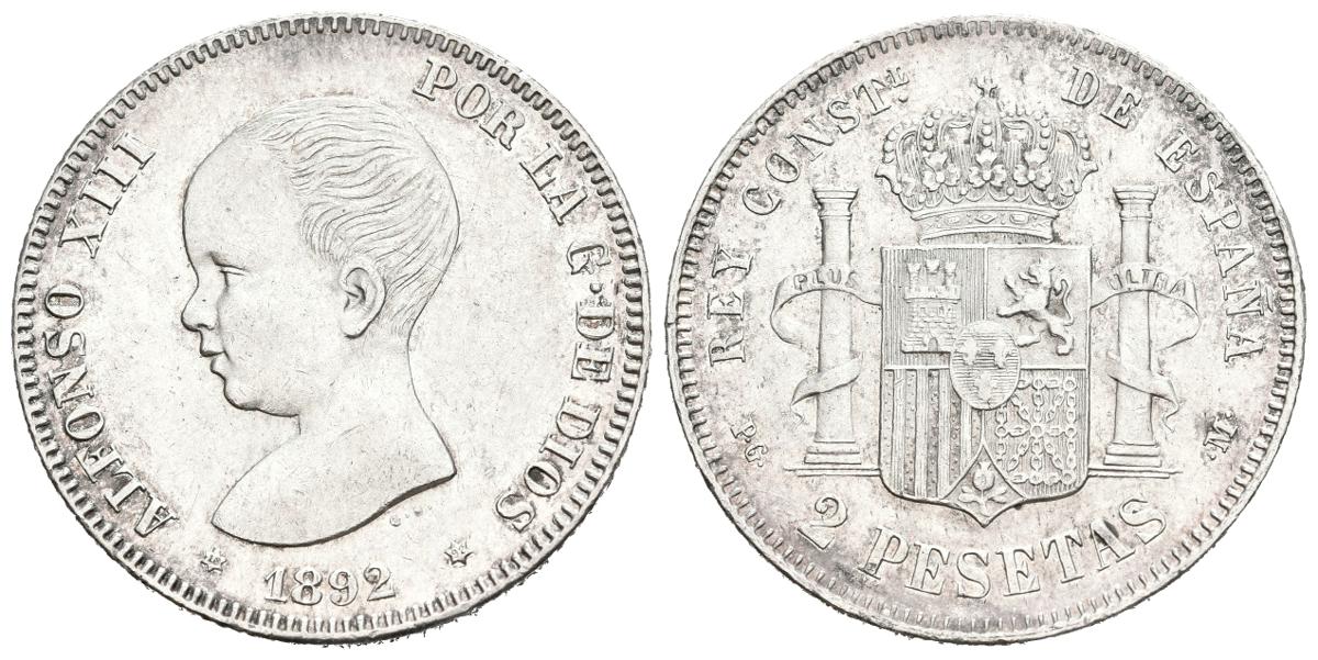 ALFONSO XIII (1885-1931). 2 Pesetas. (Ar. 10,02g/27mm). 1892*18-92. Madrid PGM. (Cal-2019-85). EBC-. Marquitas.