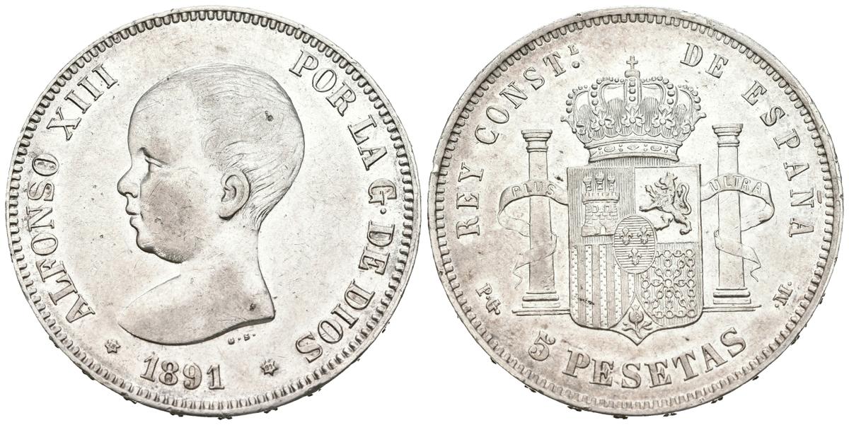 ALFONSO XIII (1885-1931). 5 Pesetas. (Ar. 24,98g/37mm). 1891 *18-91. Madrid PGM. (Cal-2019-98). MBC+/EBC-. Limpiada.