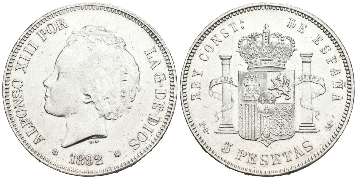ALFONSO XIII (1885-1931). 5 Pesetas. (Ar. 25,03g/37mm). 1892 *18-92. Madrid PGM. (Cal-2019-100). MBC+. Limpiada.