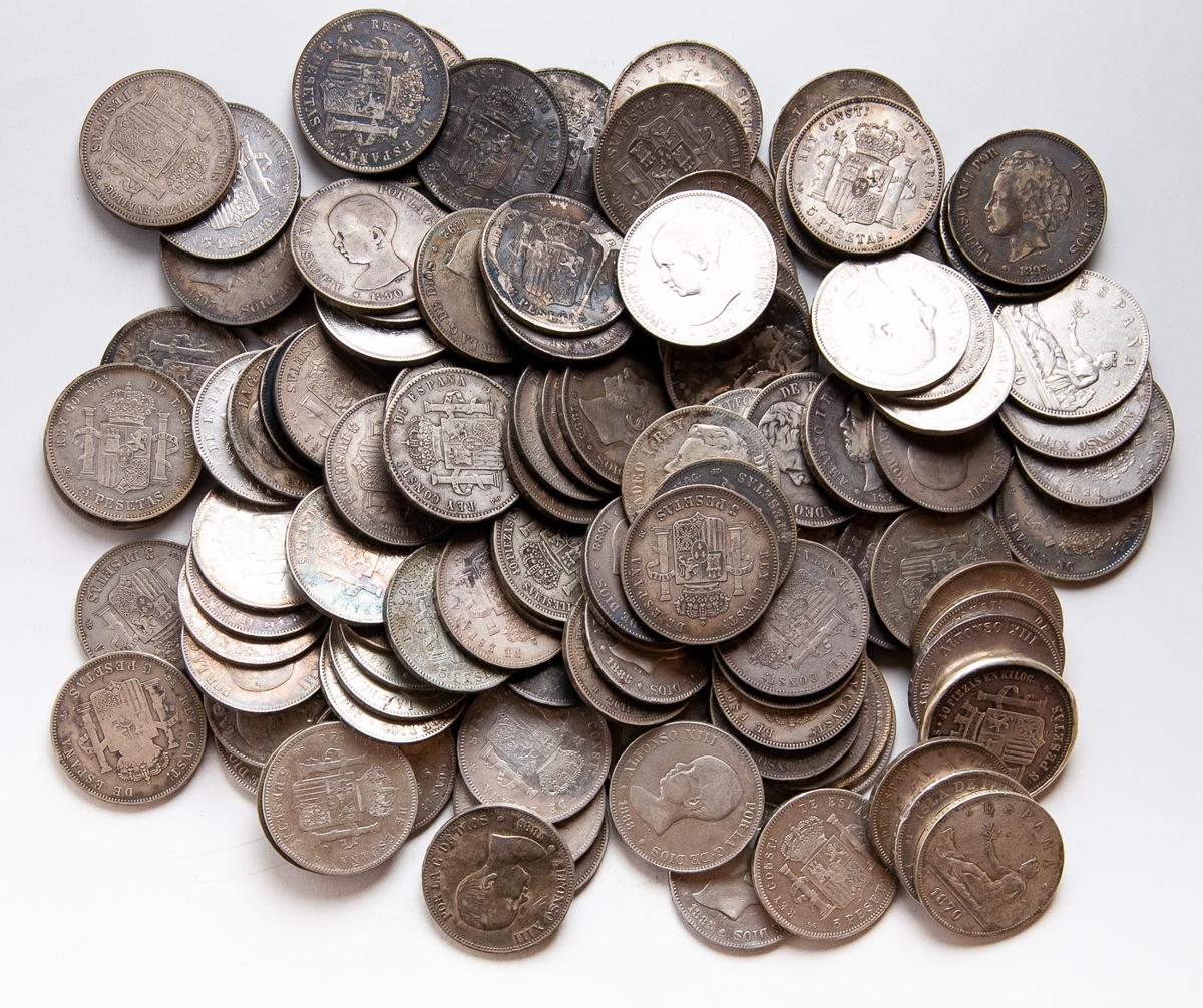Gran cojunto formado por 117 monedas del módulo de 5 Pesetas acuñadas en el periodo comprendido entre el Gobierno Provisional y el reinado de Alfonso XIII. Gran cantidad de fechas diferentes así como estados de conservación. IMPRESCINDIBLE EXAMINAR. Este lote no admite devolución.