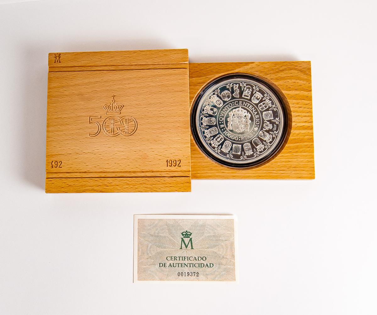 JUAN CARLOS I (1975-2014). 10.000 Pesetas. (Ar. 168,75g/73mm). V Centenario. 1989. Serie I. FDC. Presentada en estuche oficial con certificado. Tirada de 60 mil unidades.