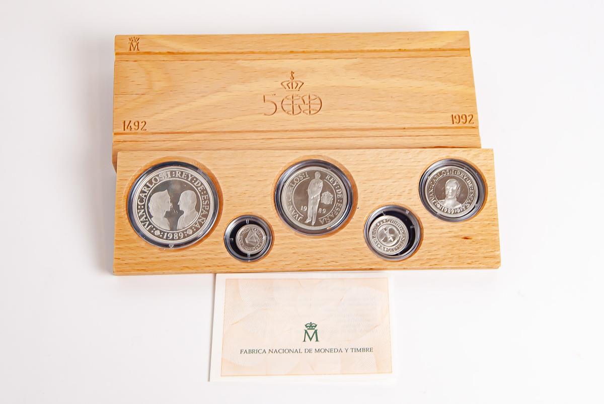 JUAN CARLOS I (1795-2014). Estuche completo compuesto por 5 monedas en plata de valores comprendidos entre 2000 y 100 Pesetas. Quinto Centenario. Juan Carlos I. 1989. Serie I. FNMT. FDC. Incluye estuche original y certificado de autenticidad.
