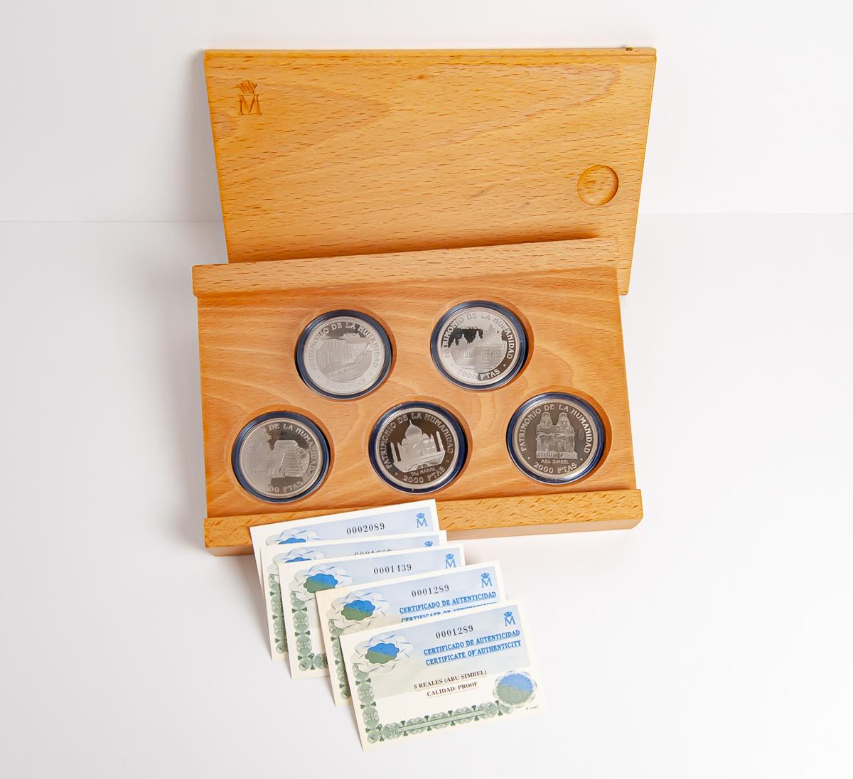JUAN CARLOS I (1975-2014). Estuche formado por 5 monedas de 2000 Pesetas. Patrimonio Mundial. 1996. FNMT. Peso y medida teóricos por monedas: 27,00g/40mm. Incluye estuche original en madera y certificados de autenticidad. Plata de 0,925 milésimas. PROOF. A EXAMINAR.