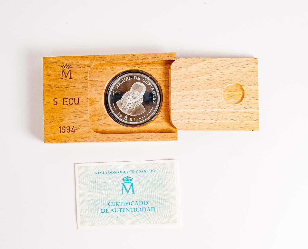 JUAN CARLOS I (1975-2014). 5 Ecu. (Ar. 33,62g/42mm). Cervantes-Don Quijote. 1994. FNMT. FDC. Incluye estuche original y certificado de autenticidad. 75 mil unidades emitidas.
