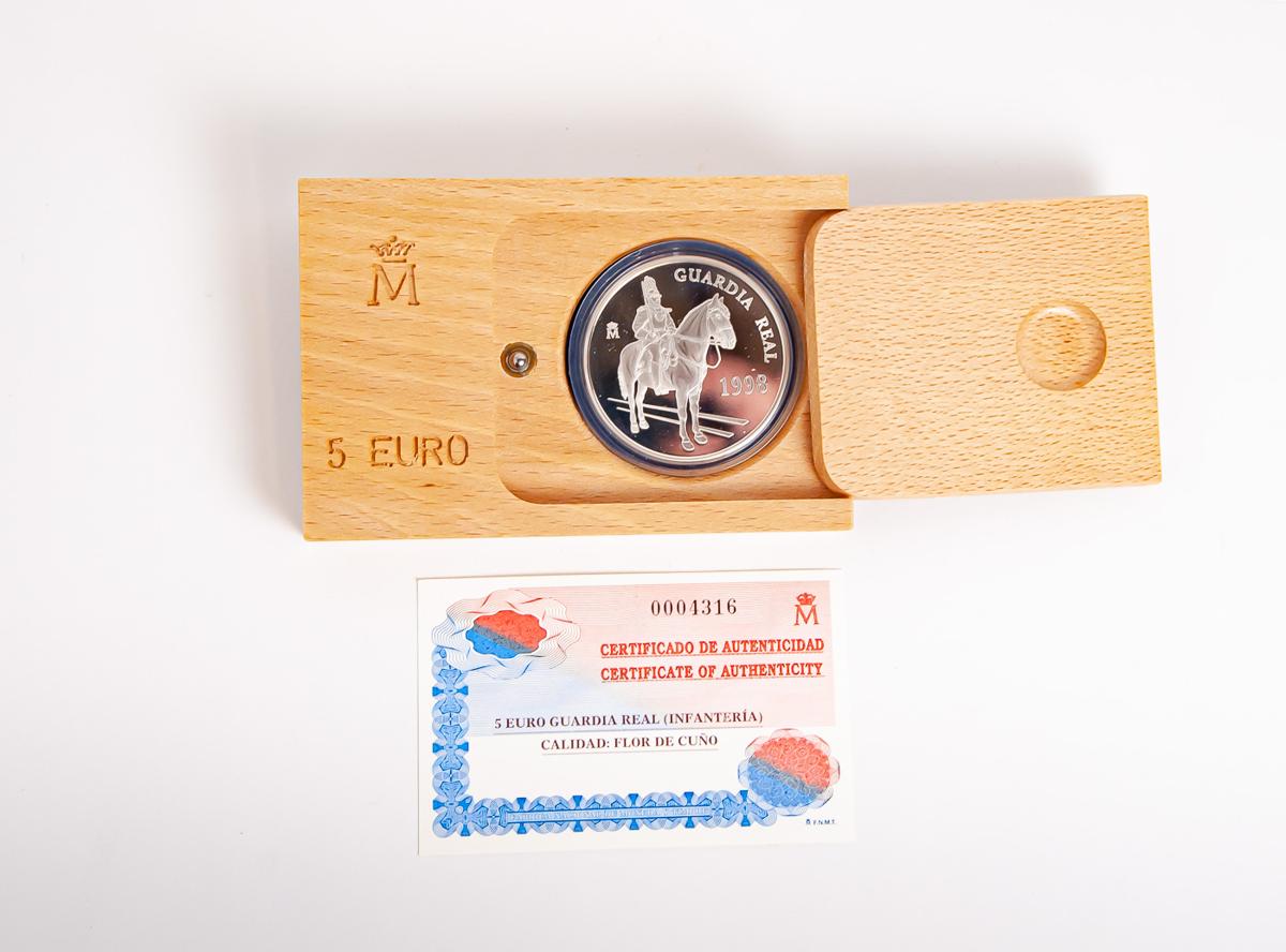 JUAN CARLOS I (1975-2014). 5 Ecu. (Ar. 33,62g /42mm). Guardia Real. Infantería. 1998. FNMT. FDC. Incluye estuche original y certificado de autenticidad.