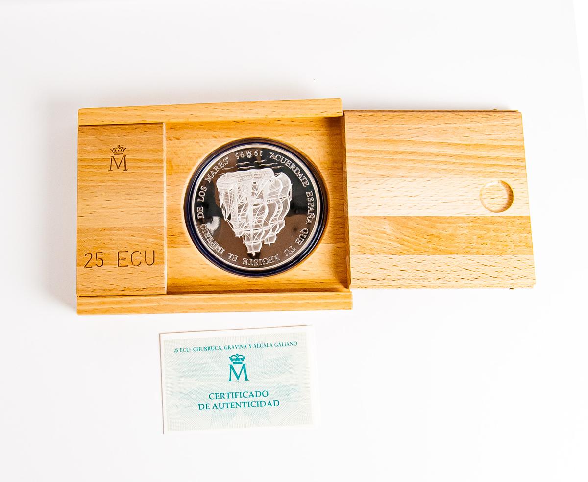 JUAN CARLOS I. 25 Ecu. (Ar. 168,75g/73mm). Serie de la Marina Española. Churruca, Gravina y Alcalá Galiano. 1995. FNMT. FDC. Presentada en estuche oficial y con certificado.