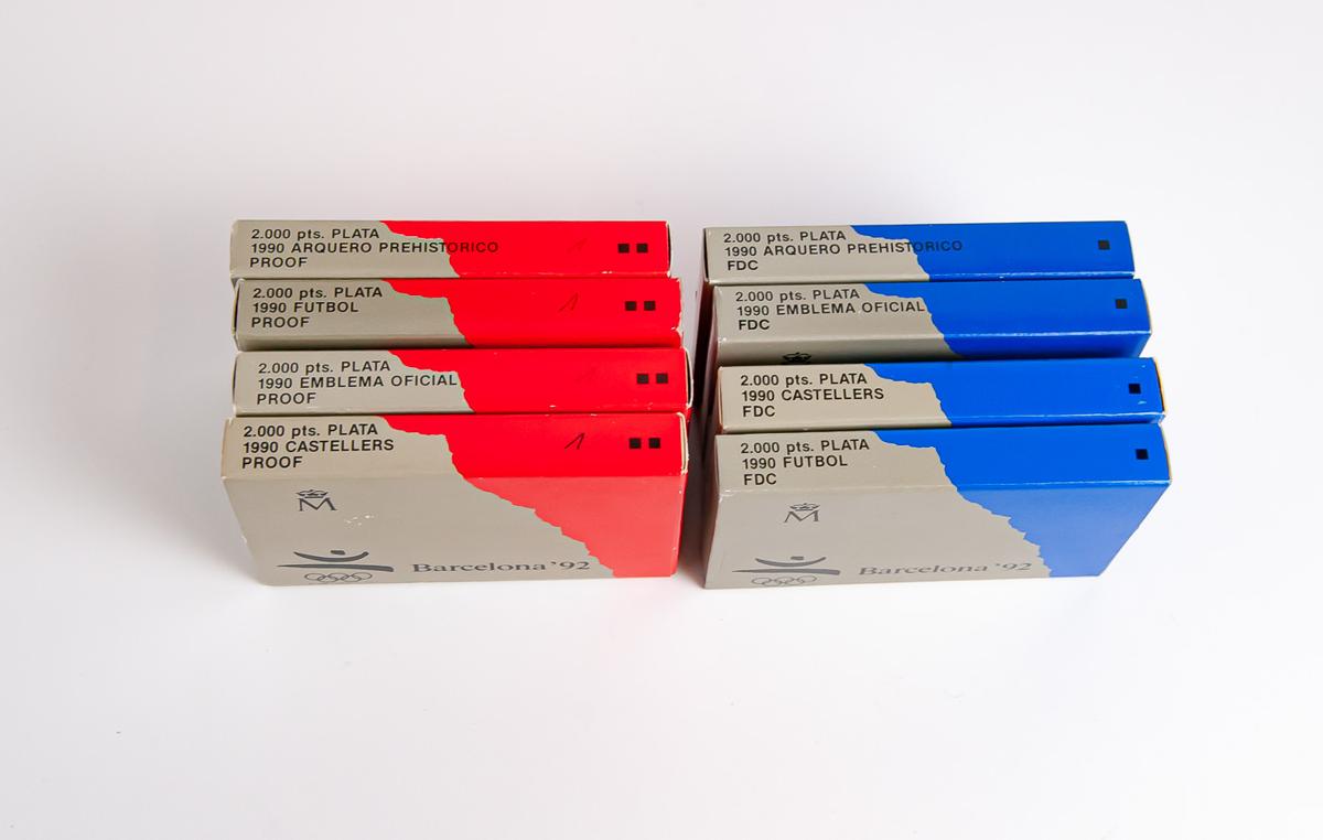 JUAN CARLOS I (1975-2104). Conjunto de 8 estuches de 2000 Pesetas acuñados en 1990. Serie Barcelona 92. todos con diferente temática: Castellers, Arquero Prehistórico, Emblema Oficial y Fúbol en versión FDC y PROOF. Incluyen estuches originales y certificados de autenticidad. A EXAMINAR.