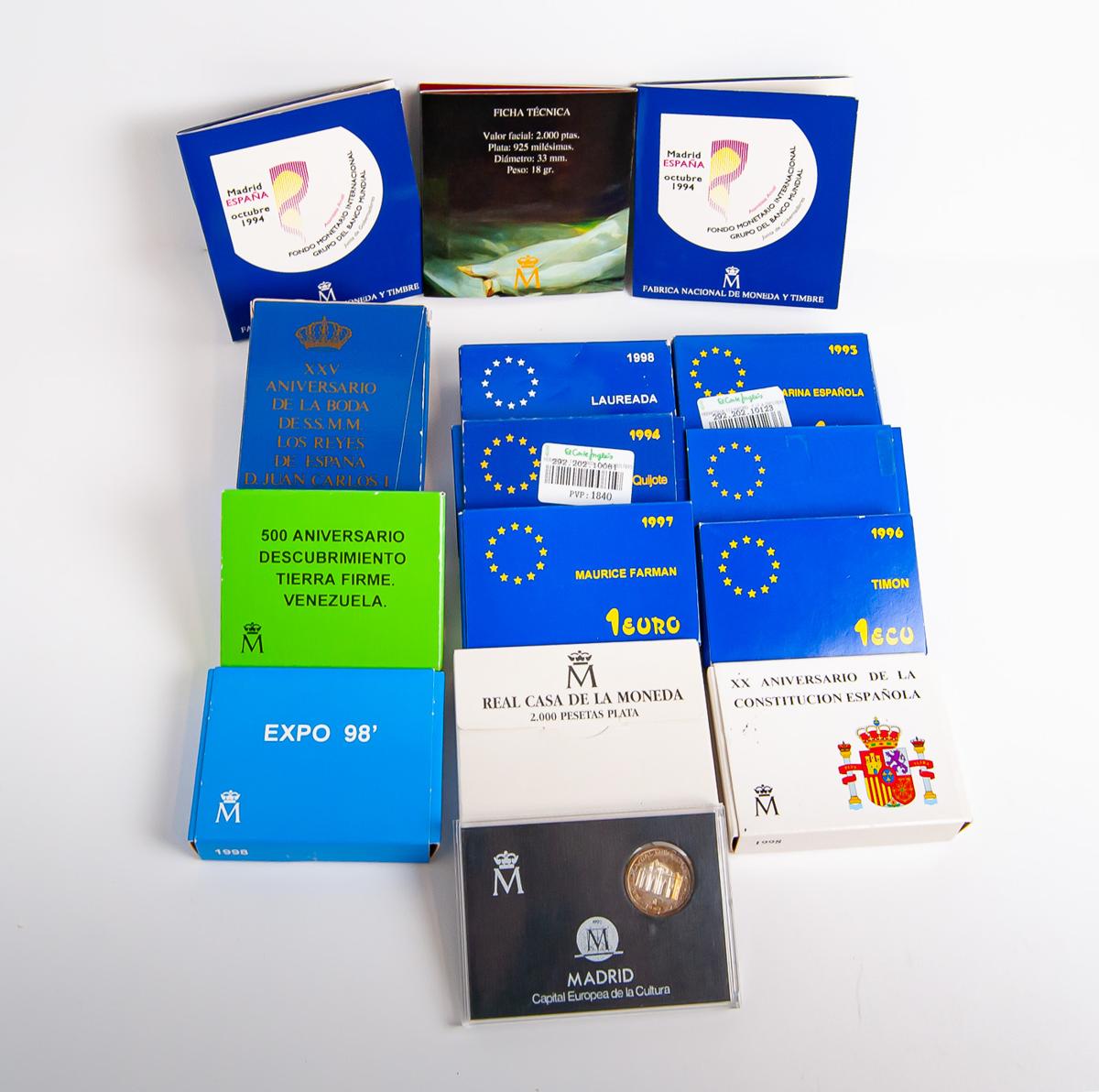 Conjunto de 15 estuches oficiales emitidos por la FNMT de diversos módulos, casi todos en plata: pesetas, ecus y euros. Perfecto estado de conservación en general conservando sus estuches originales y, en su mayoría, sus certificados de autenticidad. A EXAMINAR.