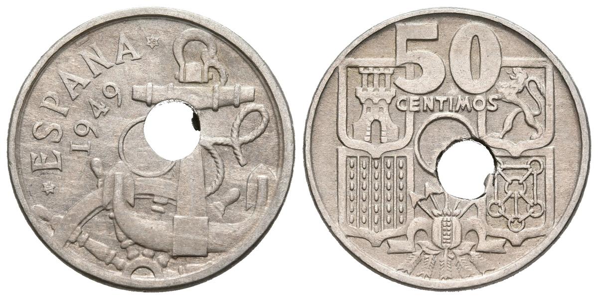 ESTADO ESPAÑOL (1936-1975). 50 Céntimos. (Cu-Ni. 3,91g/20mm). 1949 *19-56. Madrid. (Cal-2019-26). MBC+. Agujero desplazado. Estrellas visibles.
