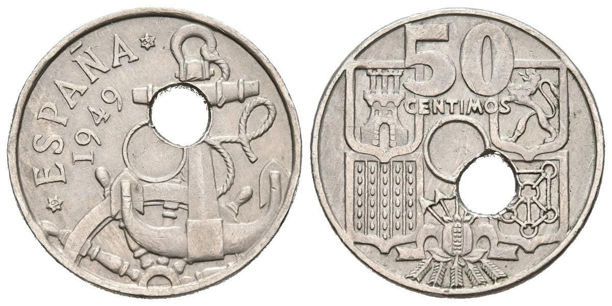 ESTADO ESPAÑOL (1936-1975). 50 Céntimos. (Cu-Ni. 3,93g/20mm). 1949 *19-62. Madrid. (Cal-2019-27). MBC+. Agujero desplazado. Estrellas visibles.