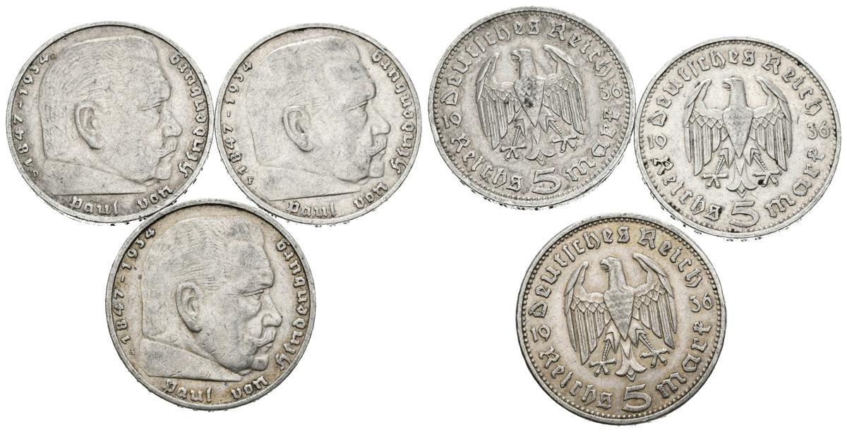 ALEMANIA. Bonito conjunto formado por 3 monedas de plata de 5 Reichsmark acuñadas en 1936 (III Reich) en tres diferentes cecas: Berlín, Múnich y Stuttgart. Diferentes estados de conservación. A EXAMINAR.