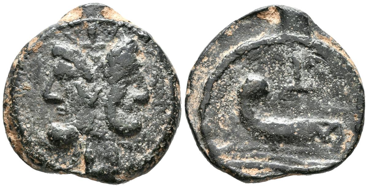 ACUÑACIONES ANONIMAS. As de imitación hispánica. (Ae. 22,02g/30mm). 100 a.C. Roma. (Crawford 56/2). Anv: Cabeza bifronte laureada de Jano, encima: I. Rev: Proa a derecha, encima: I, debajo leyenda: ¿ROMA?. MBC.