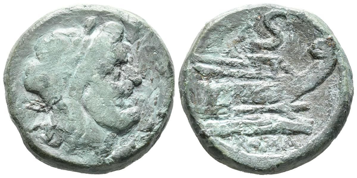 ACUÑACIONES ANONIMAS. Semis. (Ae. 16,95g/26mm). 211 a.C. Roma. (Crawford 56/3). Anv: Cabeza diademada de Saturno a derecha, detrás S. Rev: Proa a derecha, encima: S, debajo: ROMA. MBC-.