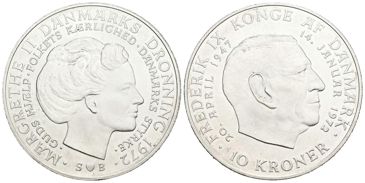 DINAMARCA. 10 Coronas. (Ar. 20,55g/36mm). 1972. Muerte de Federico IX y subida al trono de la Princesa Margarita II. (Km#858). EBC.
