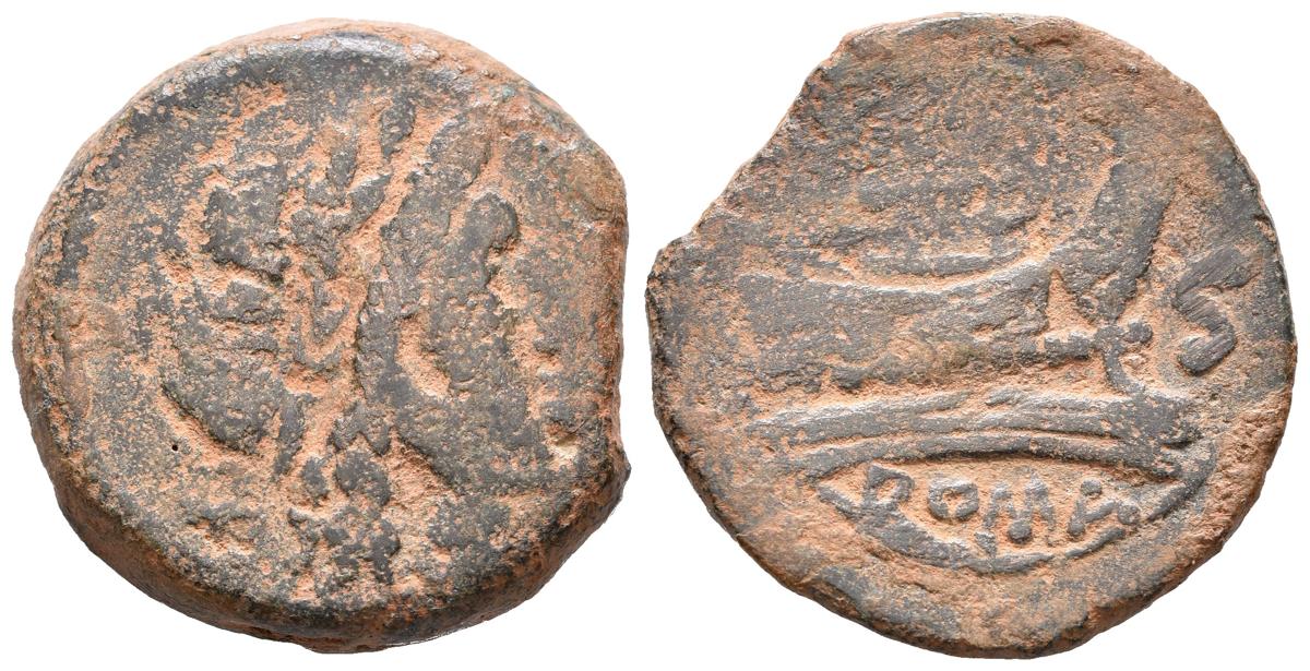 ACUÑACIONES ANONIMAS. Semis. (Ae. 11,47g/25mm). 169-158 a.C. Roma. (Crawford 195/2). Anv: Cabeza diademada de Saturno, detrás S. Rev: Proa a derecha, delante: S, debajo: ROMA. MBC-.