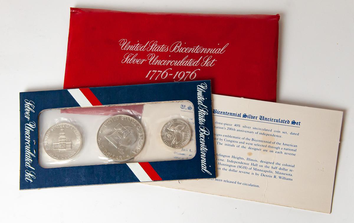 ESTADOS UNIDOS. Set completo compuesto por 3 monedas en plata conmemorativas del 200 Aniversario de la Independencia (1776-1976). Módulos de 1/4, 1/2 y 1 Dollar. Incluye estuche y certificado oficial. SC.