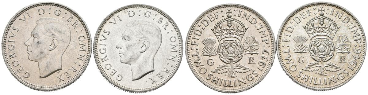 GRAN BRETAÑA. Conjunto de 2 monedas de 2 Shillings acuñados en 1937 y 1946. Jorge VI. Diferentes estados de conservación. A EXAMINAR.