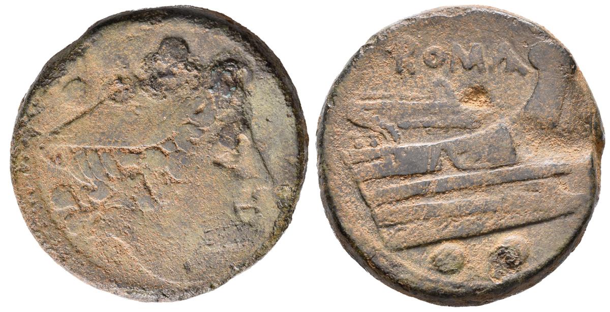ACUÑACIONES ANONIMAS. Doble Uncia. (Ae. 24,70g/29mm). 217-215 a.C. Roma. (Crawford 38/5). Anv: Cabeza de Mercurio con casco a derecha, encima dos puntos. Rev: Proa a derecha, debajo dos puntos, encima leyenda: ROMA. MBC.