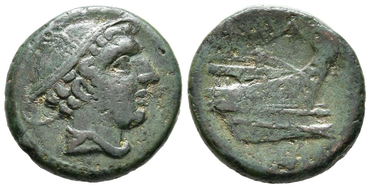 ACUÑACIONES ANONIMAS. Semiuncial. (Ae. 5,79g/20mm). 217-215 a.C. Roma. (Crawford 38/7). Anv: Busto drapeado de Mercurio con gorro. Rev: Proa a derecha, encima leyenda: ROMA. MBC/MBC-. Bonita pátina verde.