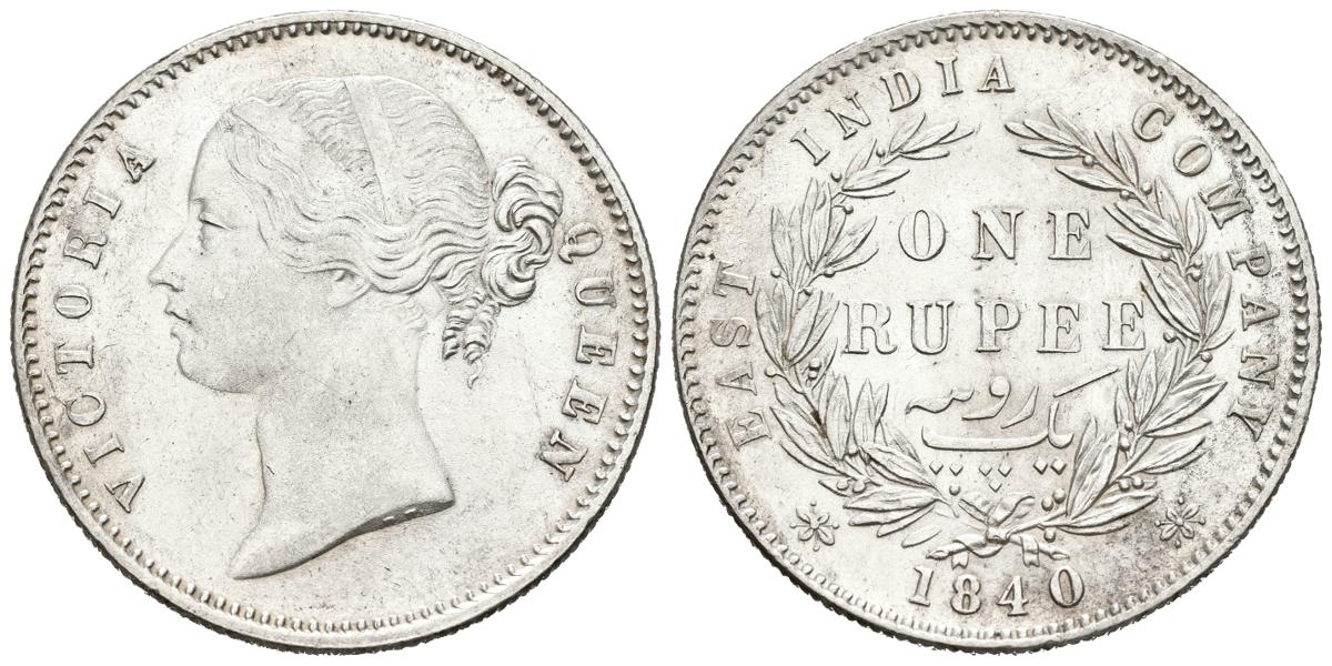 INDIA (Británica). 1 Rupia (Ar. 11,65g/31mm). 1840. Reina Victoria. Compañía de las Indias Orientales. (Km#458.3). EBC. Precioso brillo.