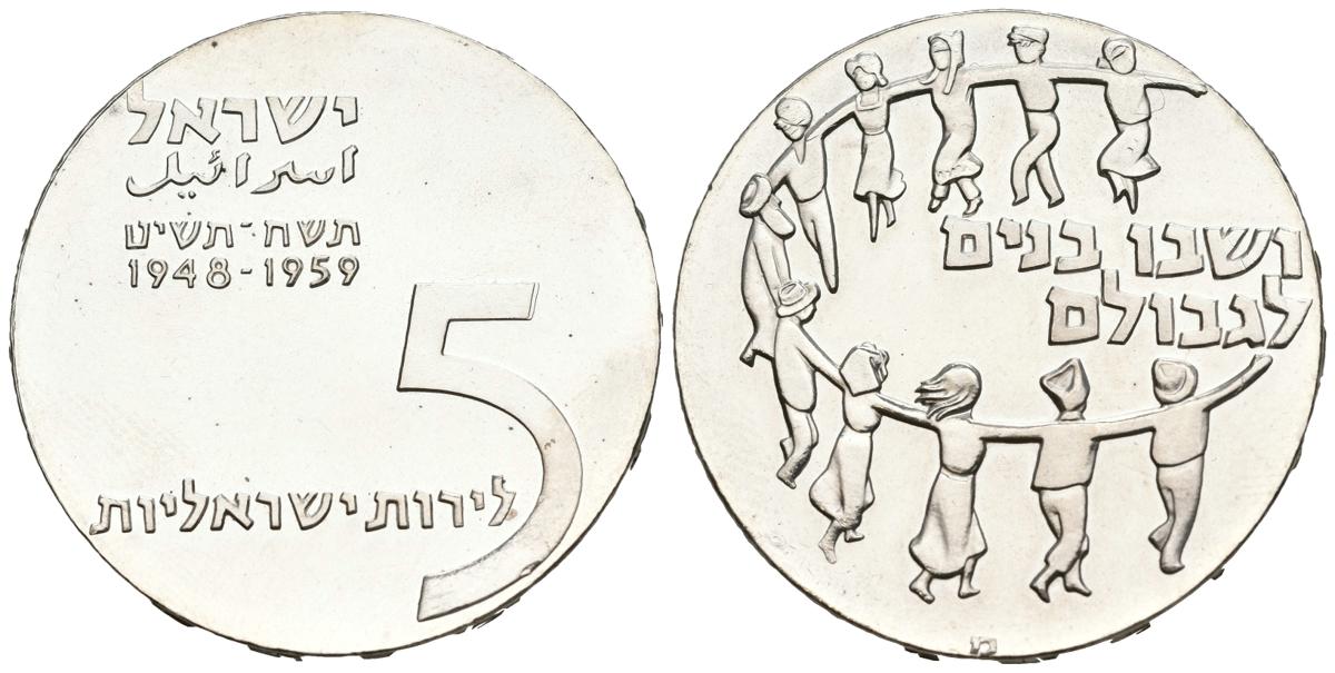 ISRAEL. 5 Lirot. (Ar. 24,90g/34mm). 1959. 11 Aniversario de la Independencia. (Km#23). SC-.