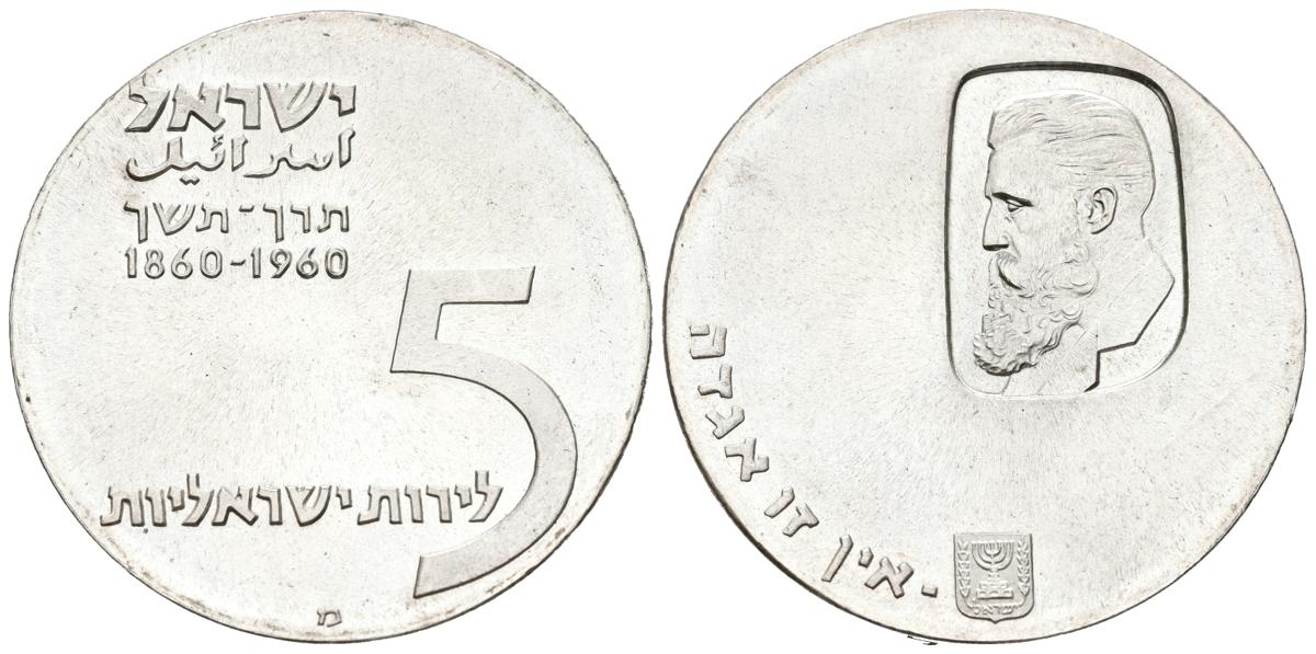 ISRAEL. 5 Lirot. (Ar. 25,05g/34mm). 1960. Centenario del Nacimiento de Theodor Herzl. ? en el anverso. (Km#29). SC-. Escasa.