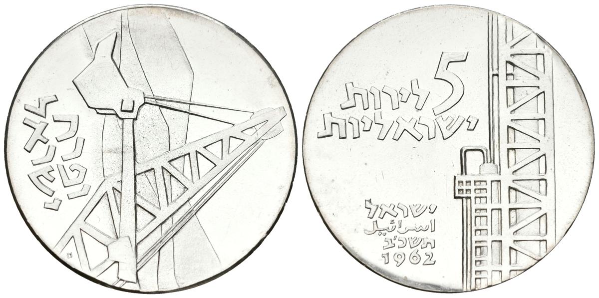 ISRAEL. 5 Lirot. (Ar. 25,06g/34mm). 1962. 14 Aniversario de la Independencia. Letra fenicia Mem en el anverso. (Km#35). SC. Escasa.