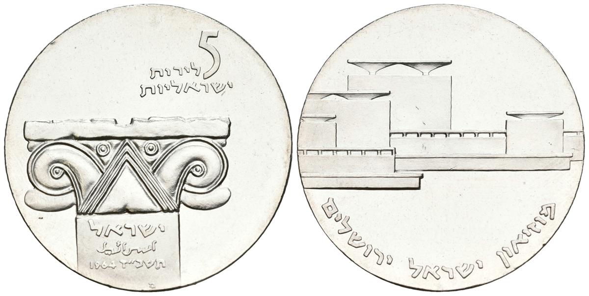 ISRAEL. 5 Lirot. (Ar. 25,05g/34mm). 1964. 16 Aniversario de la Independencia. Letra fenicia Mem en el anverso. (Km#43). SC. Escasa.