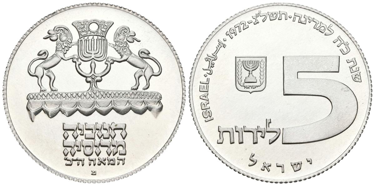 ISRAEL. 5 Lirot. (Ar. 20,00g/34mm). 1972. Janucá, Lámpara rusa. Letra fenicia Mem en el anverso. Canto estriado. (Km#69). SC.