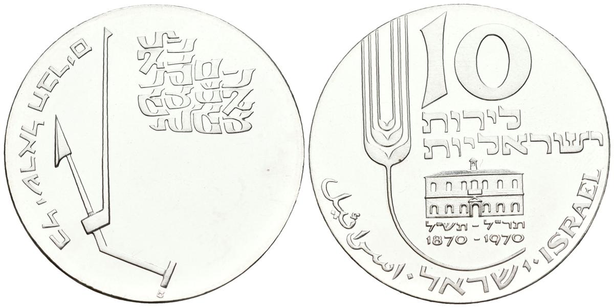 ISRAEL. 10 Lirot. (Ar. 26,16g/37mm). 1970. Berna. 22 Aniversario de la Independencia. Letra fenicia Mem en el anverso. (Km#55). SC.