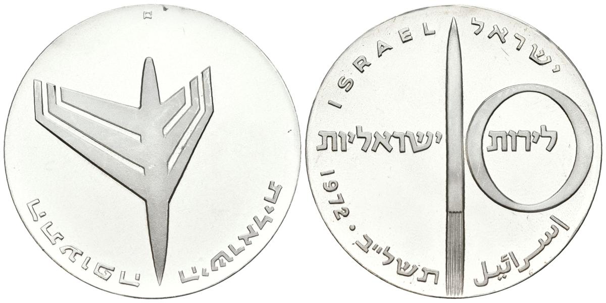 ISRAEL. 10 Lirot. (Ar. 25,90g/37mm). 1972. Berna. 24 Aniversario de la Independencia. Letra fenicia Mem en el anverso. (Km#62). SC.
