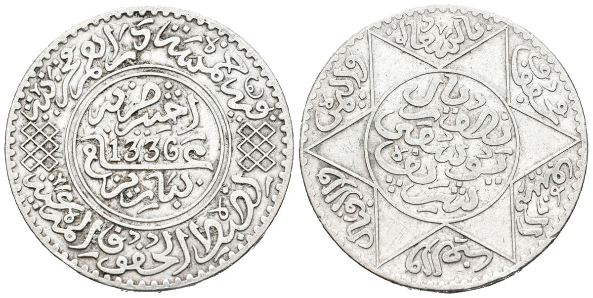 MARRUECOS. 5 Dirhams. (Ar. 12,32g /33mm). 1336H (1918). París. Protectorado francés. Yussef I (Km#32). MBC+.