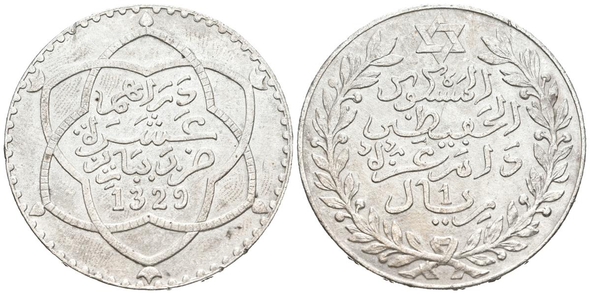 MARRUECOS. 10 Dirhams. (Ar. 24,55g/37mm). 1911 (1329H). París. (Km#25). MBC+. Oxidaciones limpiadas.