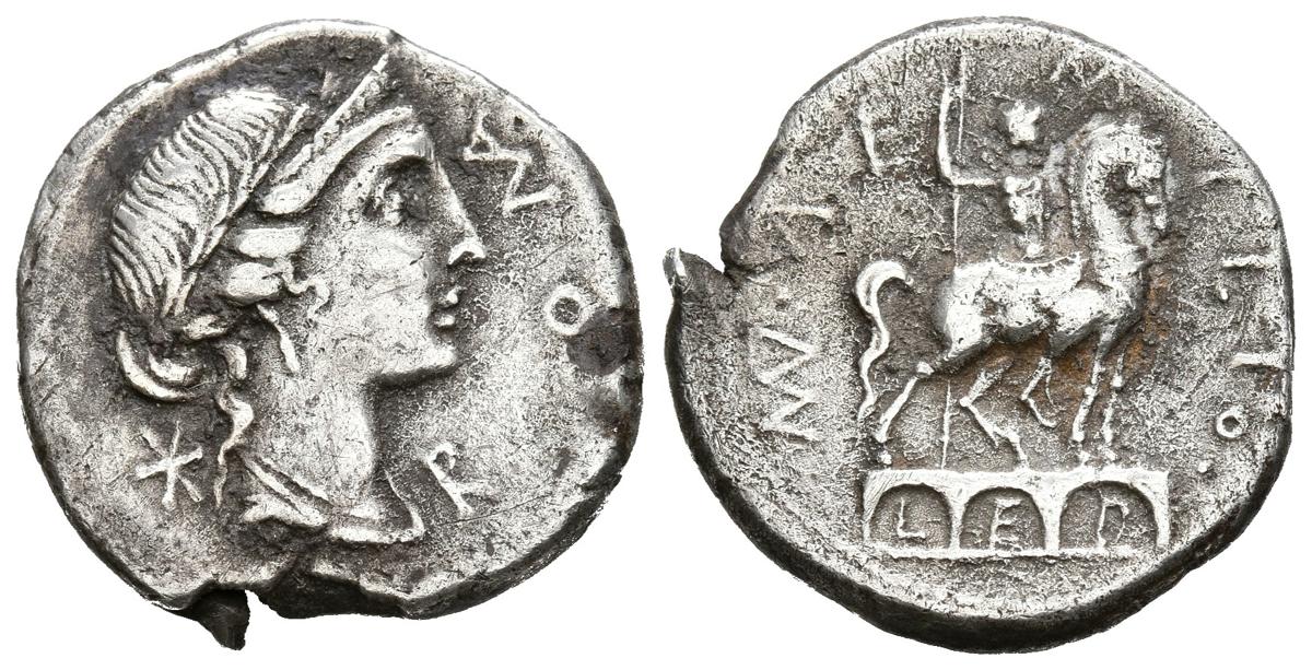GENS AEMILIA. Denario. (Ar. 3,57g/19mm). 114-113 a.C. Roma. (FFC 103; Crawford 291/1). Anv: Cabeza laureada de Roma a derecha, detrás estrella, delante leyenda: ROMA. Rev: Estatua ecuestre a derecha sobre tres arcos, dentro de ellos: LEP, alrededor leyenda: MN AEMILIO. MBC.