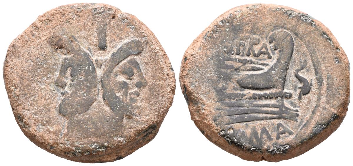 GENS AFRANIA. As. (Ae. 22,28g/32mm). 150 a.C. Roma. (Crawford 206/2). Anv: Cabeza bifronte laureada de Jano, encima: I. Rev: Proa a derecha, encima leyenda: A AFRA, delante delfín, debajo: ROMA. MBC. Escaso.