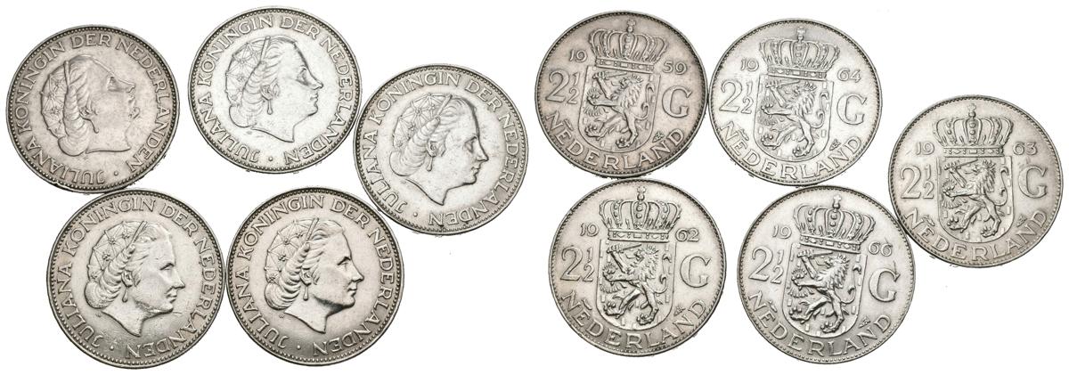 PAÍSES BAJOS. Conjunto de 5 monedas de plata de 2 1/2 Gulden acuñados en 1959, 1962, 1963, 1964 y 1966. Diferentes estados de conservación. A EXAMINAR.