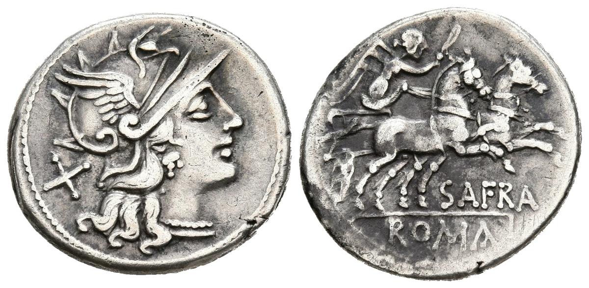 GENS AFRANIA. Denario. (Ar. 3,79g/19mm). 150 a.C. Roma. (FFC 133; Crawford 206/1). Anv: Cabeza de Roma a derecha, detrás X. Rev: Victoria con látigo en biga a derecha, debajo leyenda: SAFRA, en exergo: ROMA. MBC.