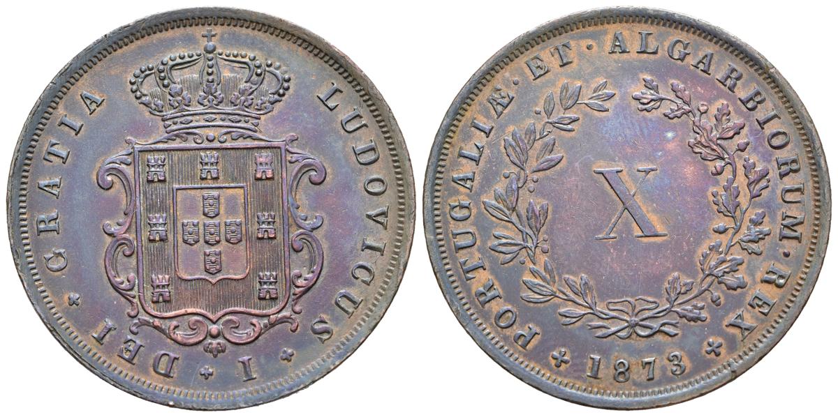 PORTUGAL. X Reis (Ae. 12,75g/33mm). 1874. Luis I. (Km#514). EBC+. Preciosa pátina. Escasa así.