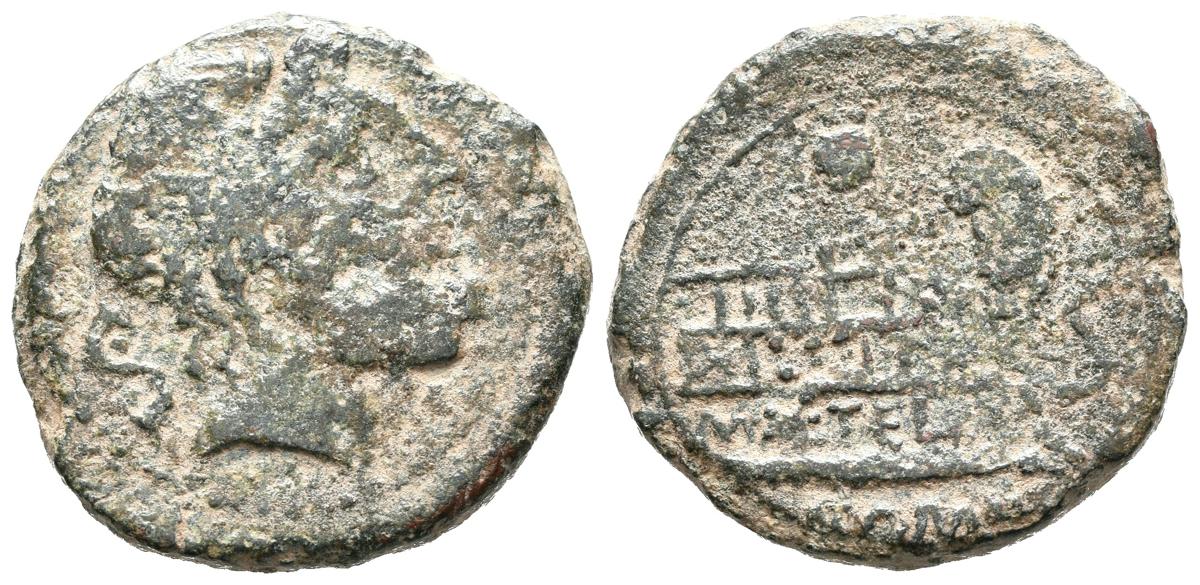 GENS CAECILIA. Semis. (Ae. 7,85g/23mm). 127 a.C. Roma. (Crawford 263/3a). Anv: Cabeza laureada de Saturno a derecha, detrás S. Rev: Proa a derecha con inscripción: M METELLVS, debajo roma, delante: S, encima escudo. MBC-. Escaso ejemplar.