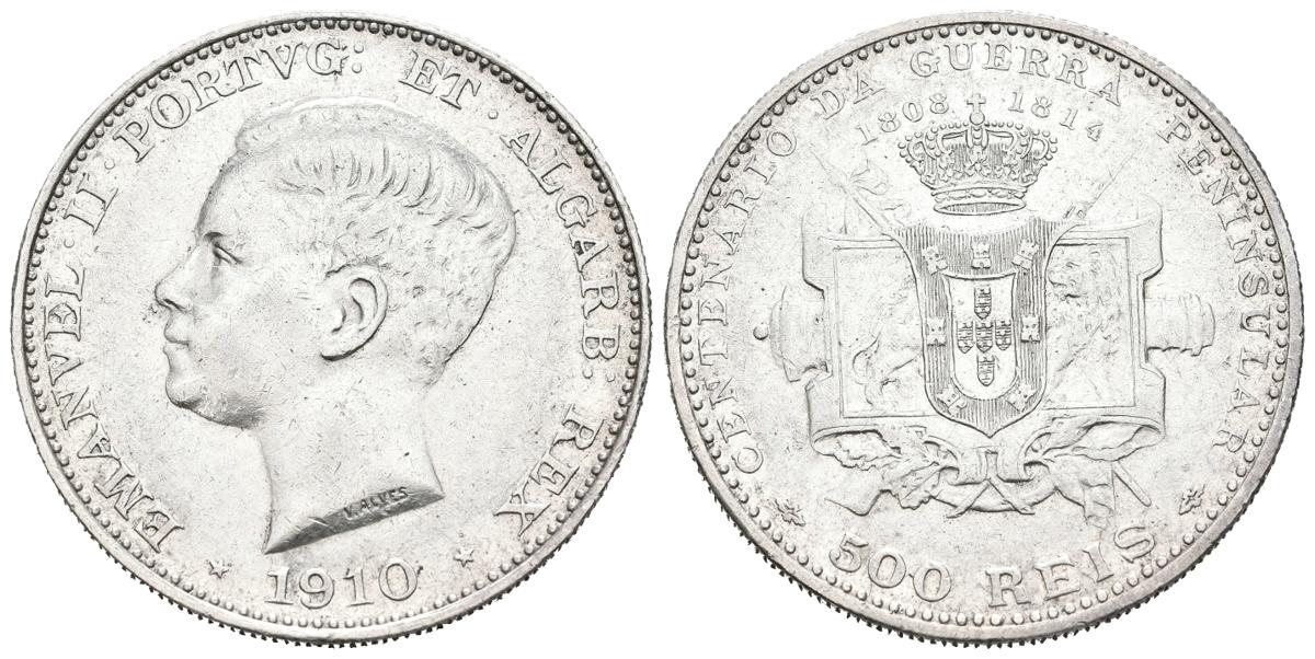 PORTUGAL. 500 Reis (Ar. 12,55g/31mm). 1910. Manuel II. Centenario de la Guerra Peninsular. (Km#556). MBC+.