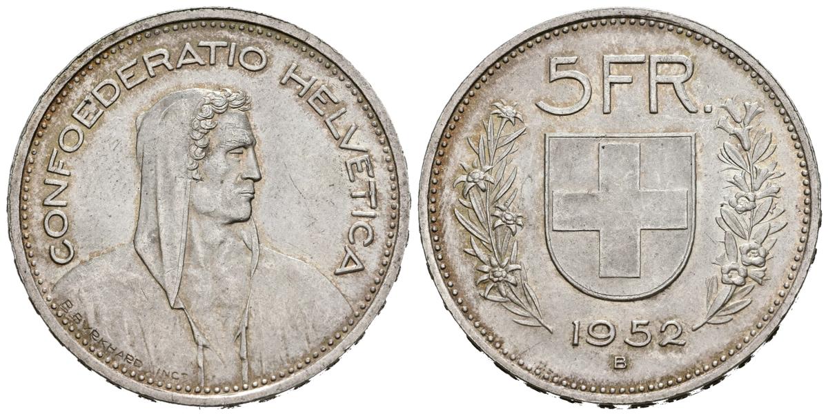 SUIZA. 5 Francos. (Ar. 15,06g/31mm). 1952. Berna B. (Km#40). EBC+. Restos de brillo original. Escasa.