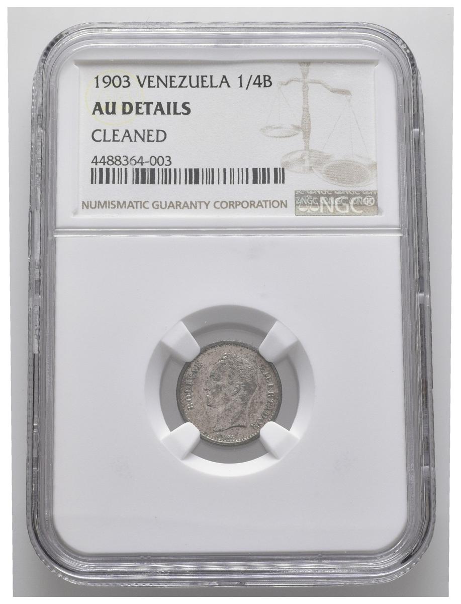 ESTADOS UNIDOS DE VENEZUELA. 1/4 Bolívar. (Ar. 1,25g/15mm). 1903. (Km#Y20). Encapsulado NGC AU Details. Limpiada