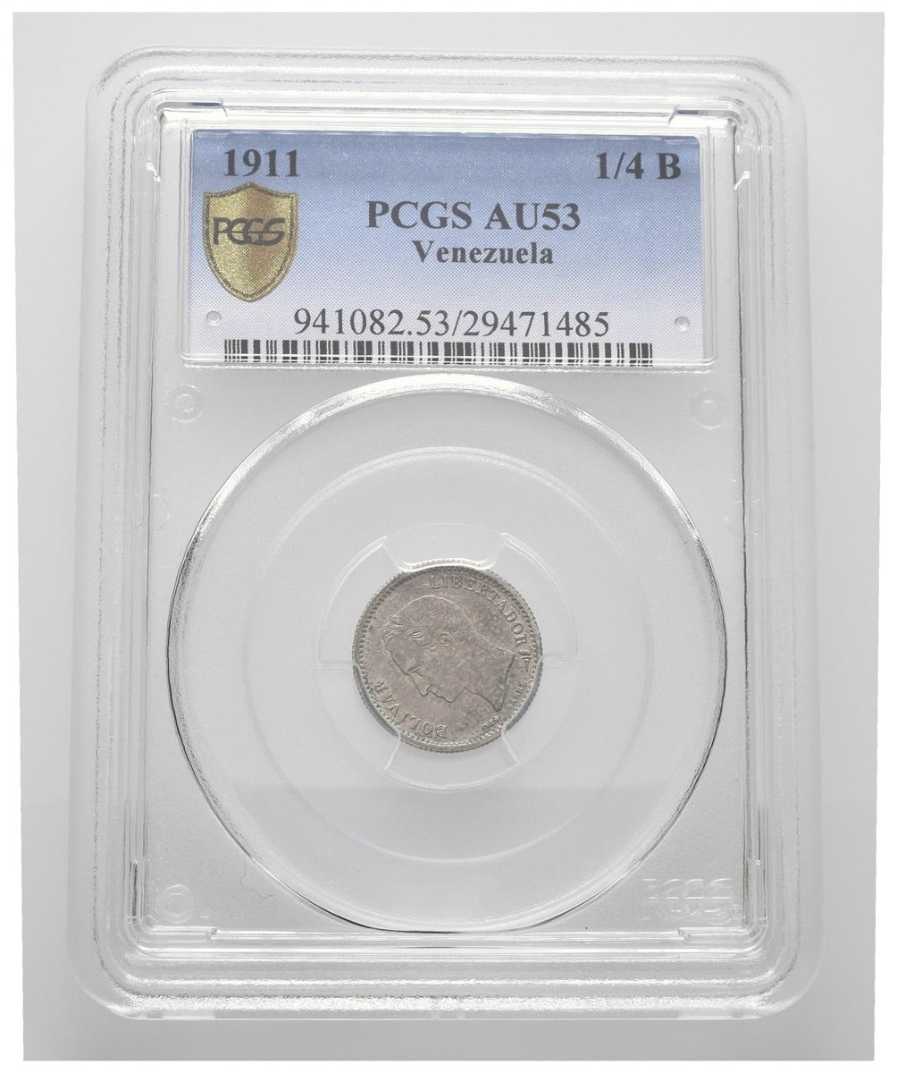 ESTADOS UNIDOS DE VENEZUELA. 1/4 Bolívar. (Ar. 1,25/15mm). 1911. (Km#Y20). Encapsulado PCGS AU-53.