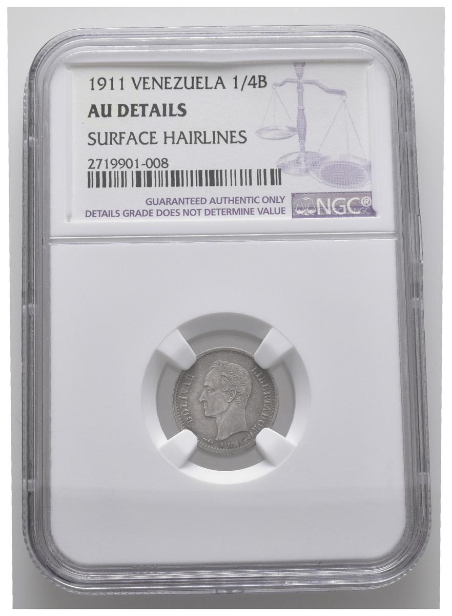 ESTADOS UNIDOS DE VENEZUELA. 1/4 de Bolívar. (Ar. 1,25g/15mm). 1911. (Km#Y20). Encapsulado NGC AU Details. Rayitas.